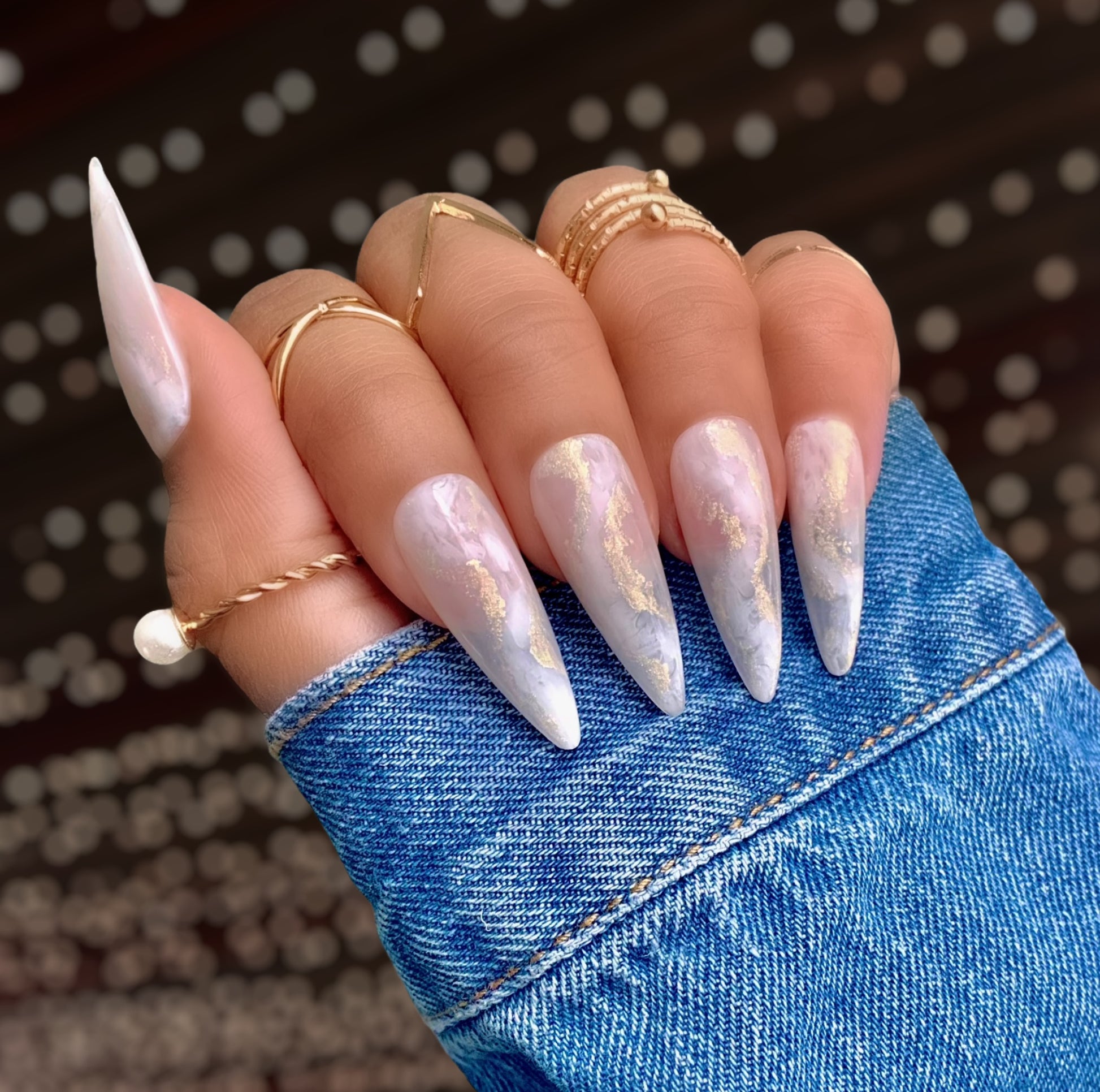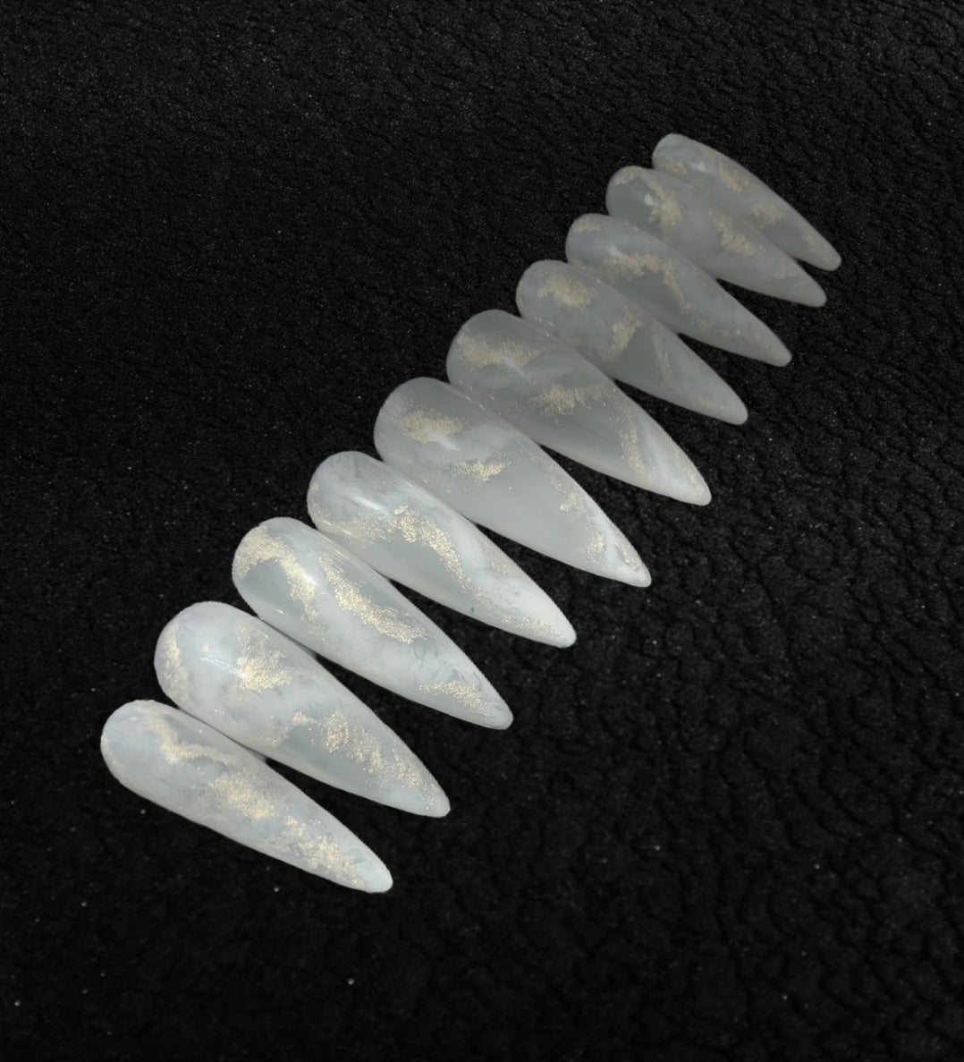 Set of 10 luxe jelly white press on nails with shimmering gold accents.